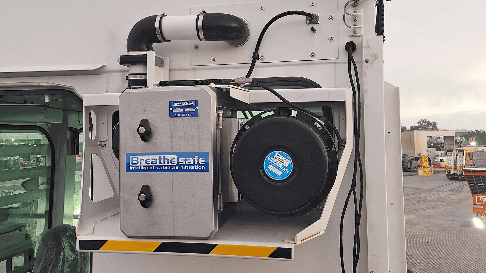 Connected to a BreatheSafe pressuriser, this dual-stage cartridge combines HEPA H13 filtration with KOH-impregnated activated carbon to remove fine dust, VOCs, diesel fumes, and acidic gases.